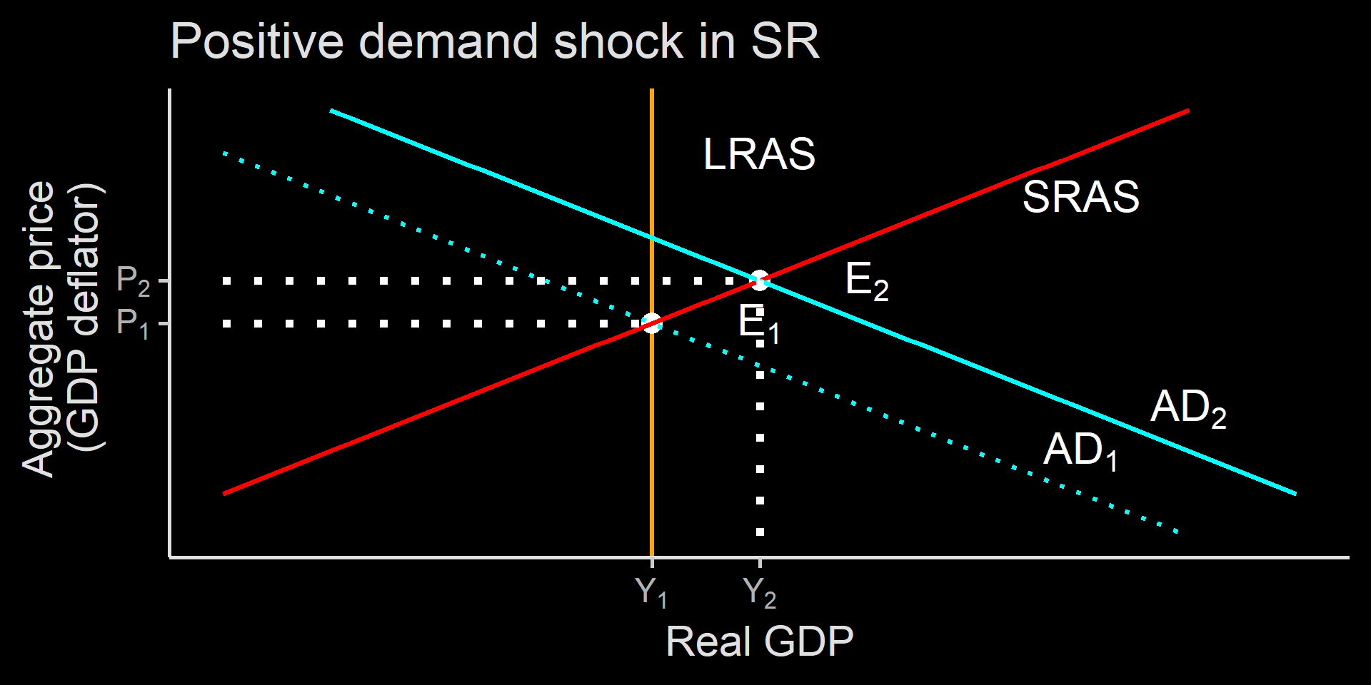 A positive demand shock (e.g. government stimulus) leads to a shifts of AD and movement along the SRAS curve, ended up with higher output and an increase in aggregate prices.