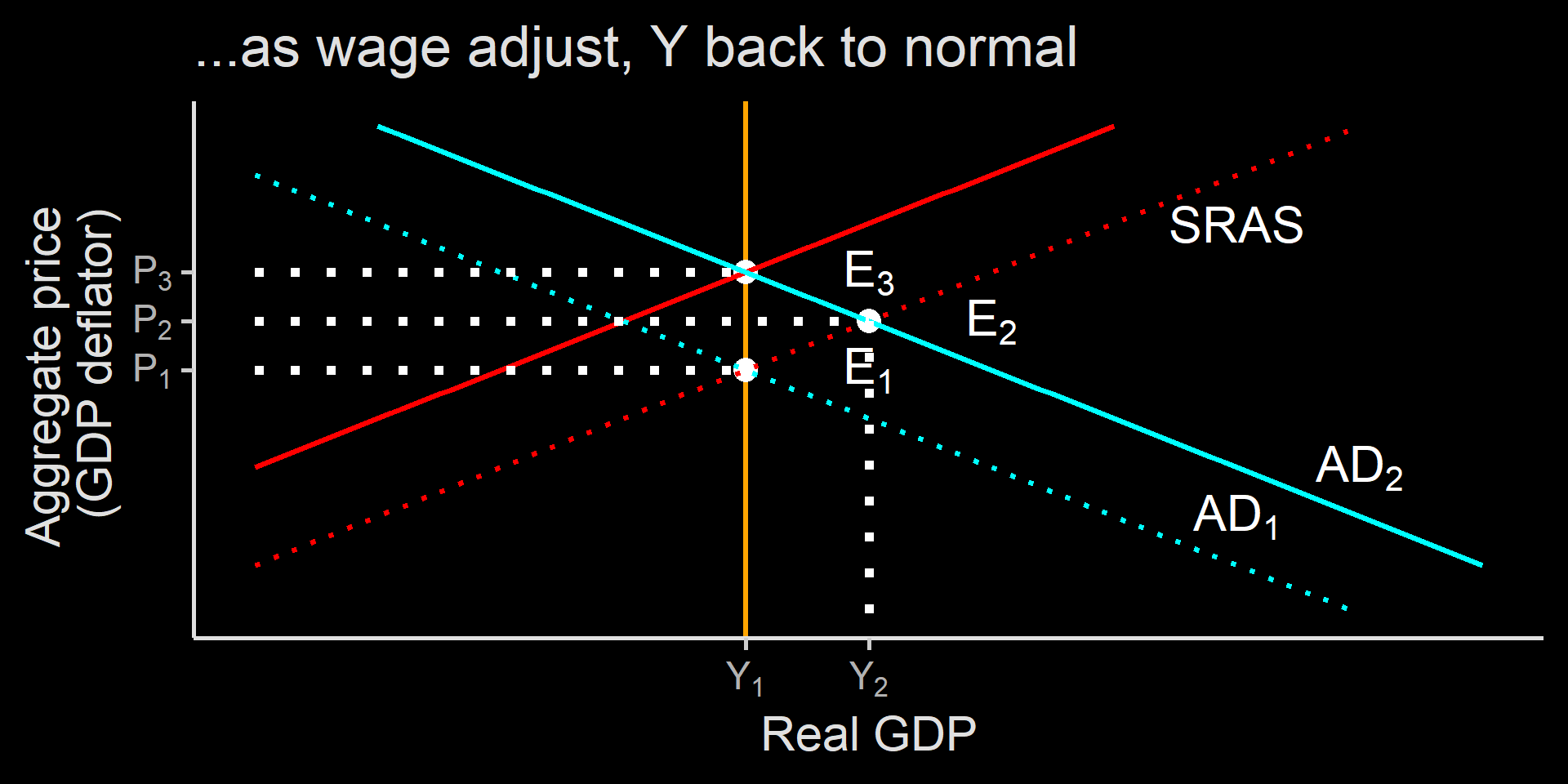 Remember that in the long-run, output will not stay low or stay high: it will eventually return to its potential long-run growth.