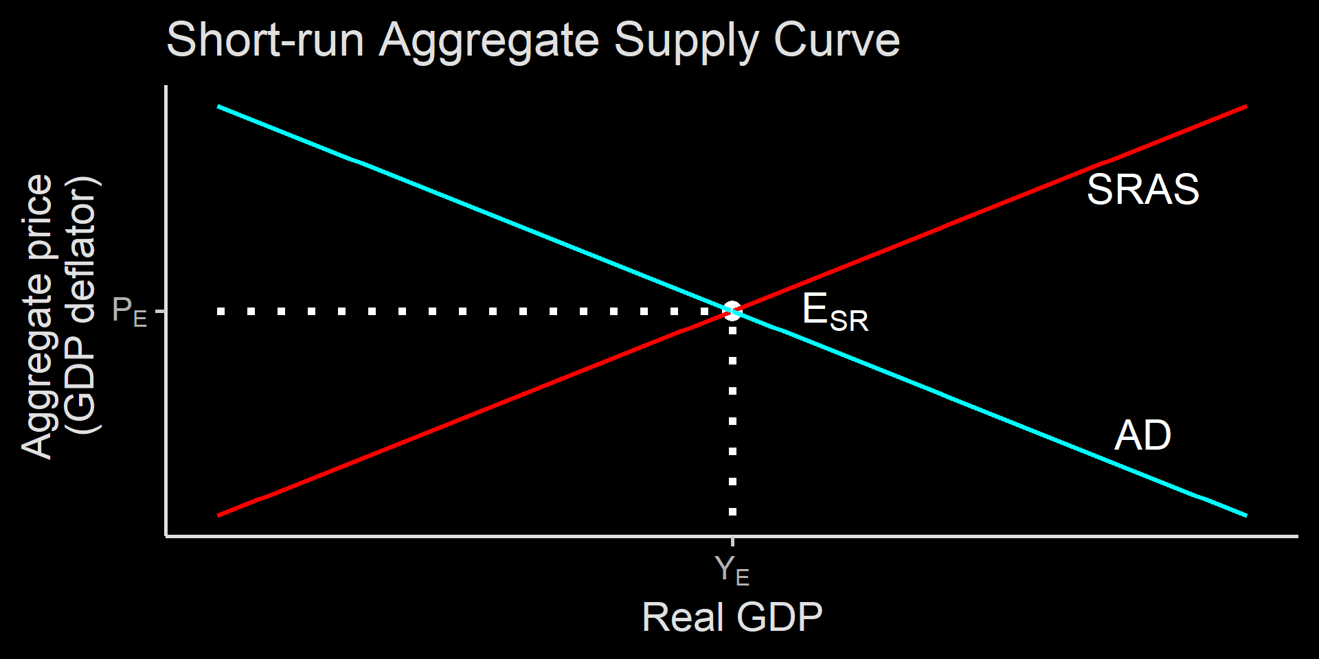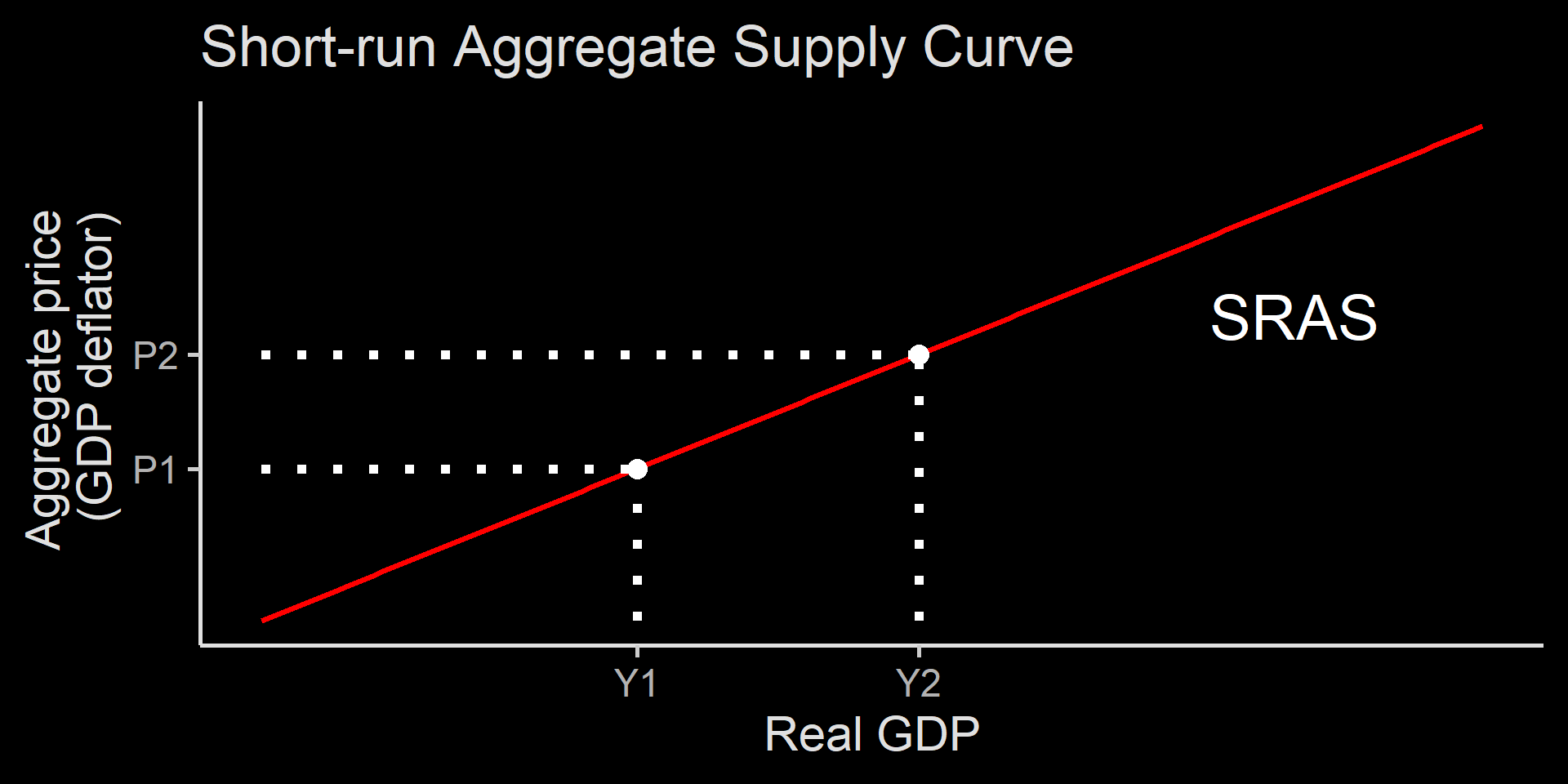 The short-run aggregate supply (SRAS) is upward sloping: when aggregate price level goes down, quantity supplied goes down as well.