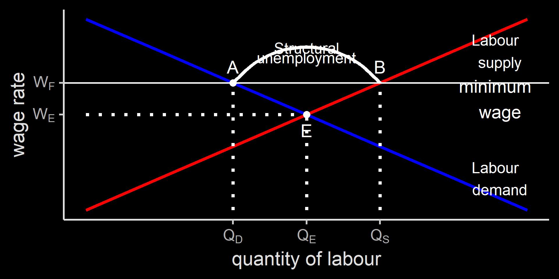 This is due to a price floor-like effect which prevent wage to hit a market clearing wage rate.