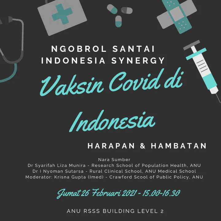 Rasanya sangat lumrah jika ada ketertarikan yang tinggi terhadap program vaksinasi di Indonesia. Indonesia Synergy, sekumpulan mahasiswa di Canberra, mencoba mangakomodir keinginan beberapa warga Canberra terutama para mahasiswa untuk mengadakan diskusi santai mengenai beberapa permasalahan dan optimisme mengenai program vaksinasi massal ini.