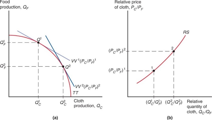 When \(\frac{P_C}{P_F} \uparrow\), slope gets steeper, production decision moves to Q2. This changes reflected in the market as a relative supply of cloth.