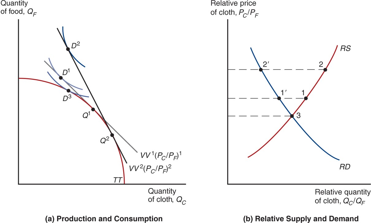 When \(\frac{P_C}{P_F} \uparrow\), VV’s slope steepen. Production & consumption moves from \(\{Q^1,D^1\}\) to \(\{Q^2,D^2\}\). \(D^3=Q^3\) is the autarky equilibrium.