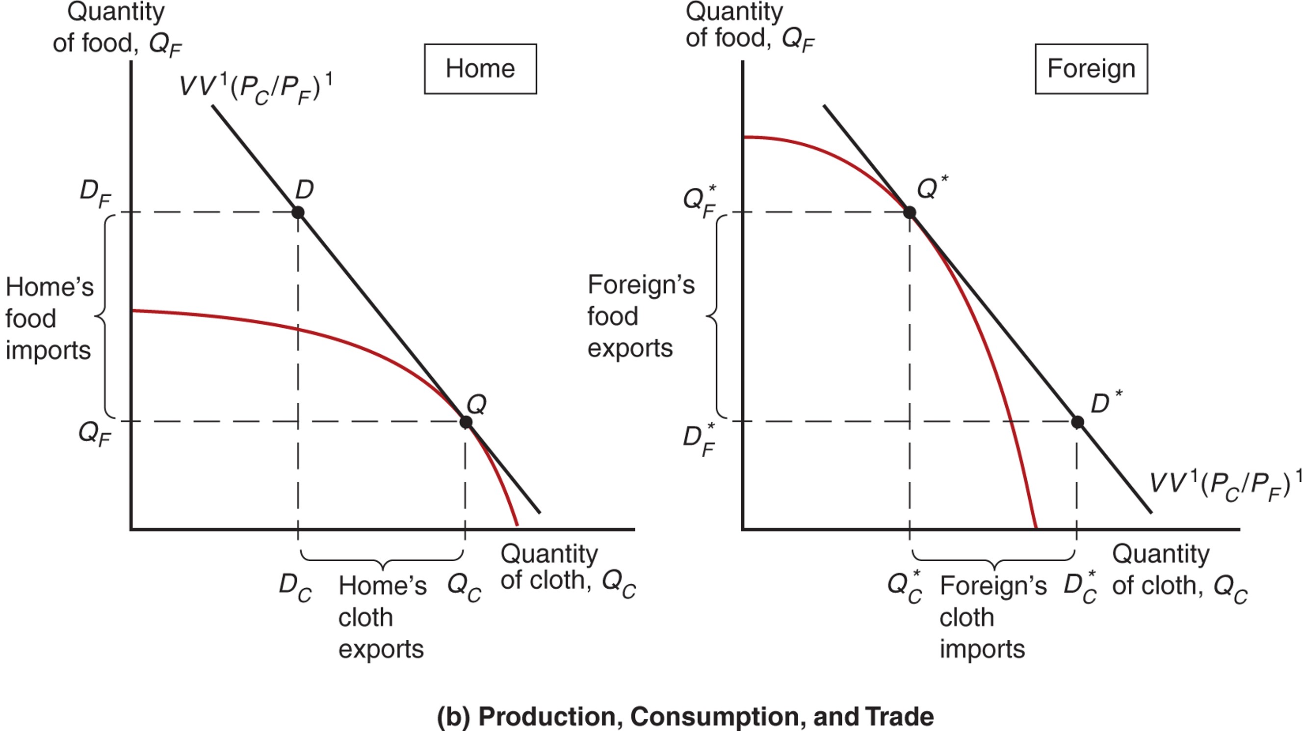 w/o trade, home has lower \(\frac{P_C}{P_F}\) and higher C production relative to F cuz it’s good at making \(C\).