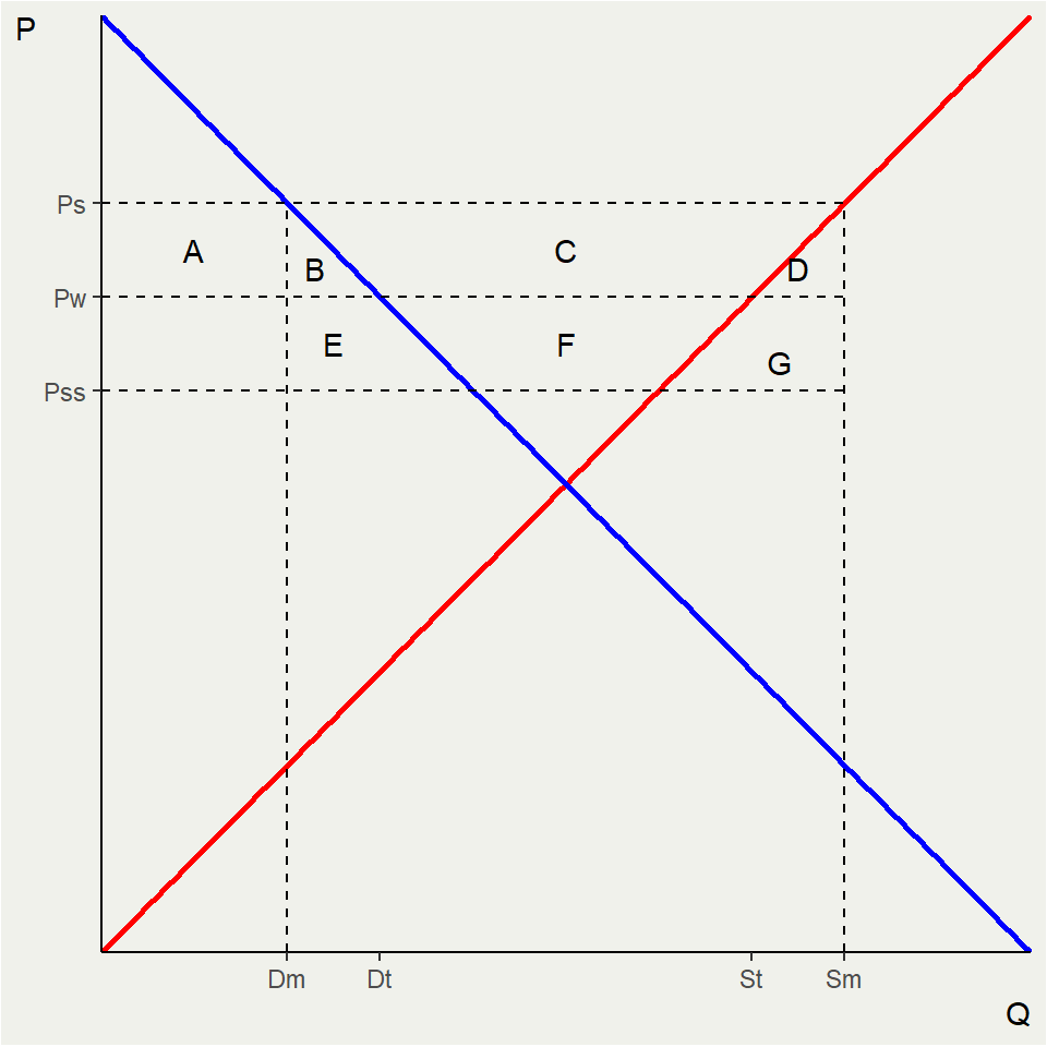 - Cuma karena ada penurunan harga dunia dari Pw→Ptt, maka A,B,C dan D jadi lebih kecil dari kalau small country.