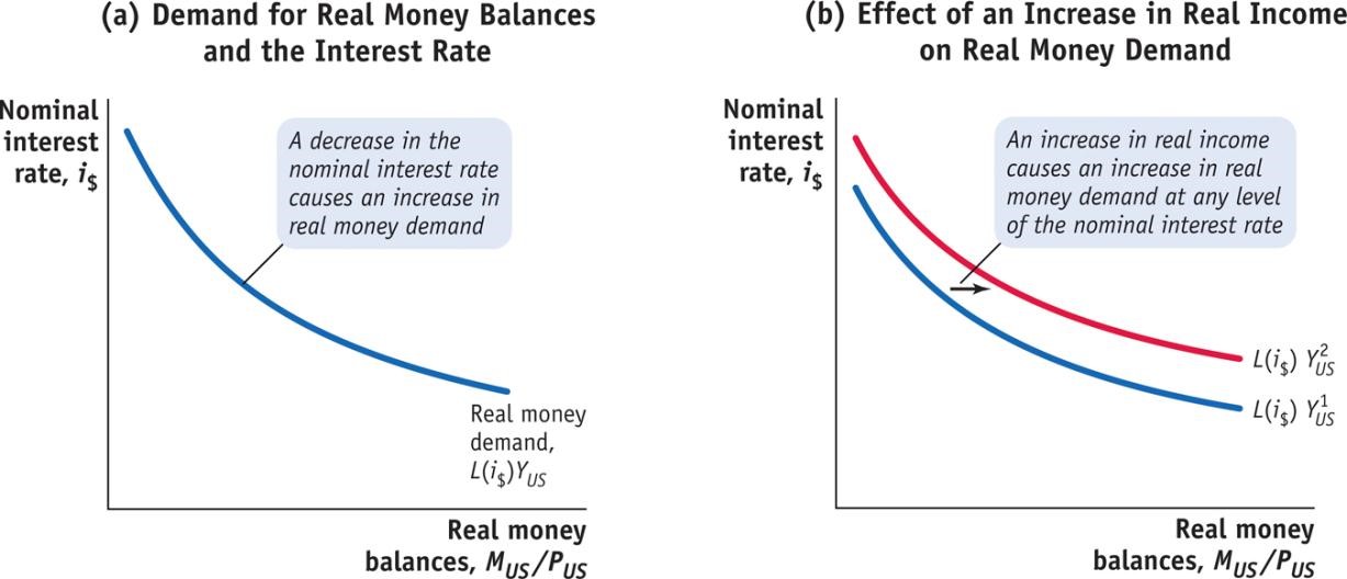 The higher innterest rate, the lower money demand is. An increase in real income will shifts the curve to the right