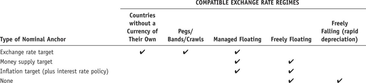 This table illustrates the possible exchange rate regimes that are consistent with various types of nominal anchors. Countries that are dollarized or in a currency union have a “superfixed” exchange rate target. Pegs, bands, and crawls also target the exchange rate. Managed floats have no preset path for the exchange rate, which allows other targets to be employed. Countries that float freely or independently are judged to pay no serious attention to exchange rate targets; if they have anchors, they will involve monetary targets or inflation targets with an interest rate policy. The countries with “freely falling” exchange rates have no serious target and have high rates of inflation and depreciation