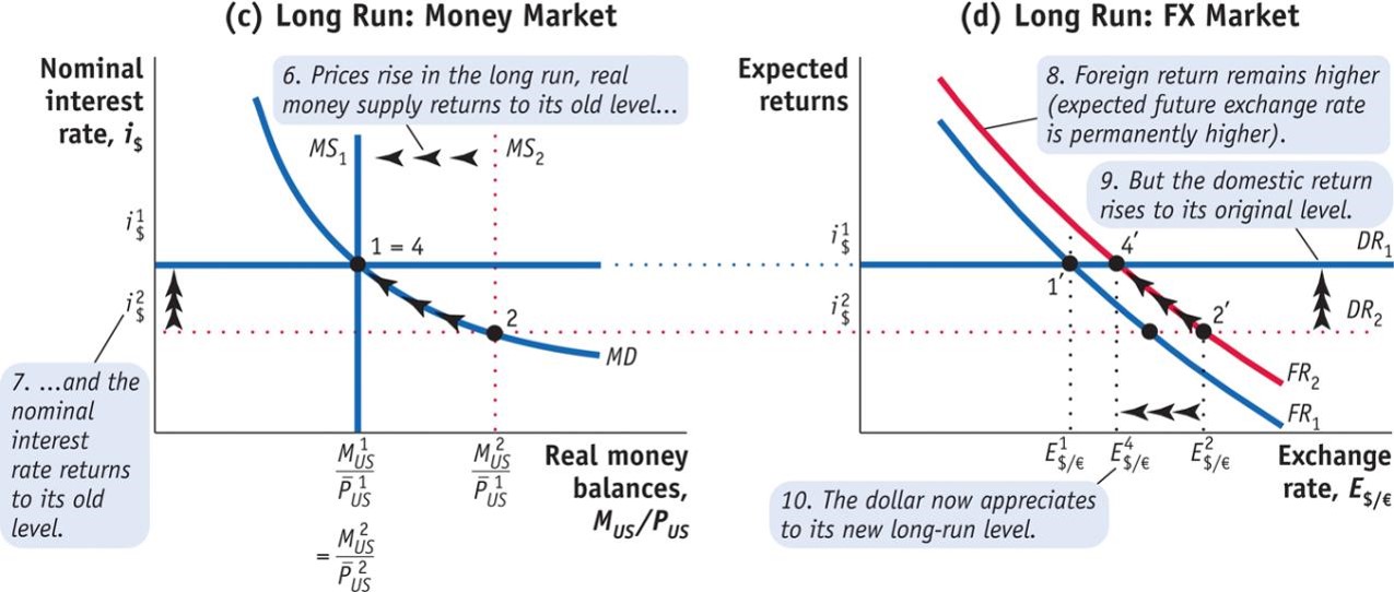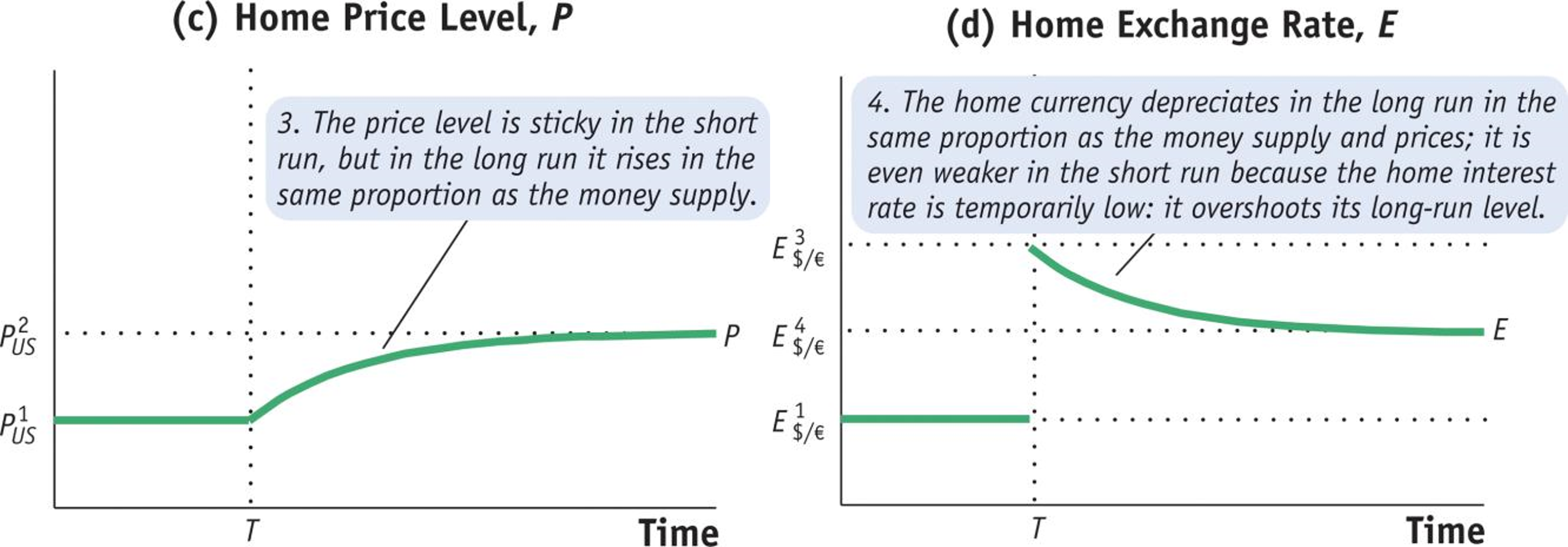 In panel (c), in the long run, prices rise in the same proportion as the money supply. In panel (d), in the short run, the exchange rate overshoots its long-run value (the dollar depreciates by a large amount), but in the long run, the exchange rate will have risen only in proportion to changes in money and prices.