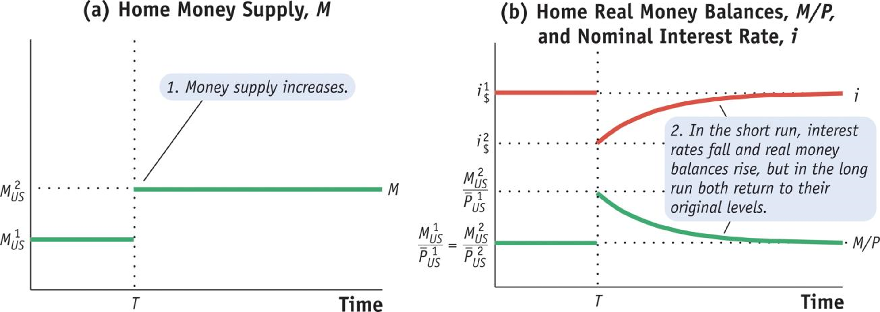 In panel (b), prices are sticky in the short run, so there is a short-run increase in the real money supply and a fall in the home interest rate over time.