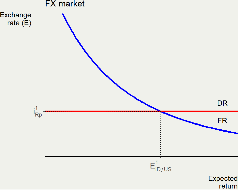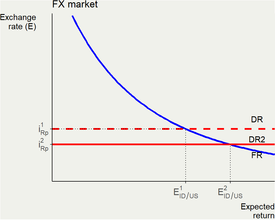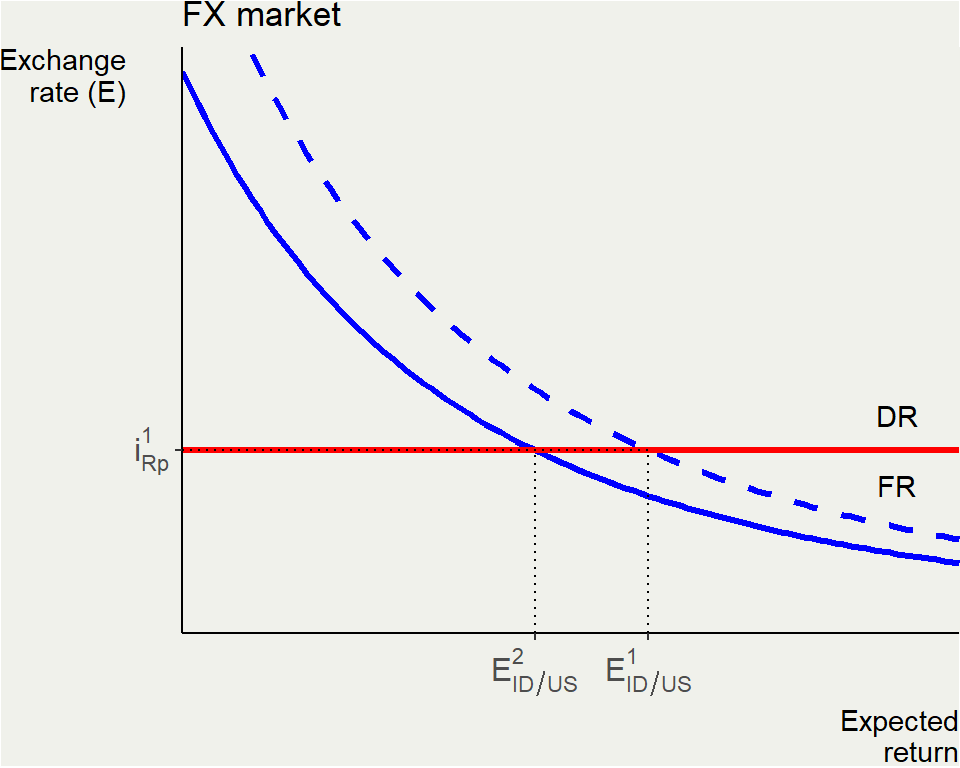 In the rupiah-dollar FX market, the reduction of indonesian interest rate causes Domestic rate to fall, leading to a depreciation of IDR (E \(\uparrow\)).
