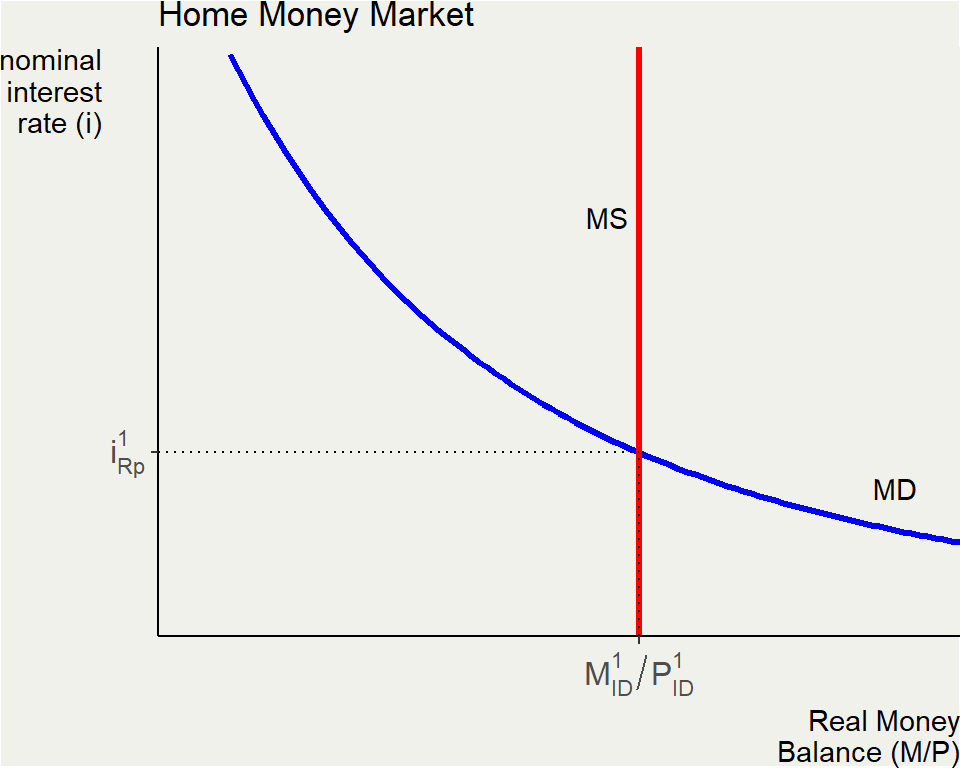 \[\begin{equation} \frac{M_{ID}}{\bar{P}_{ID}}=L(i_{Rp}) \times Y_{ID} \\ \frac{M_{US}}{\bar{P}_{US}}=L(i_{\$}) \times Y_{US} \end{equation}\]