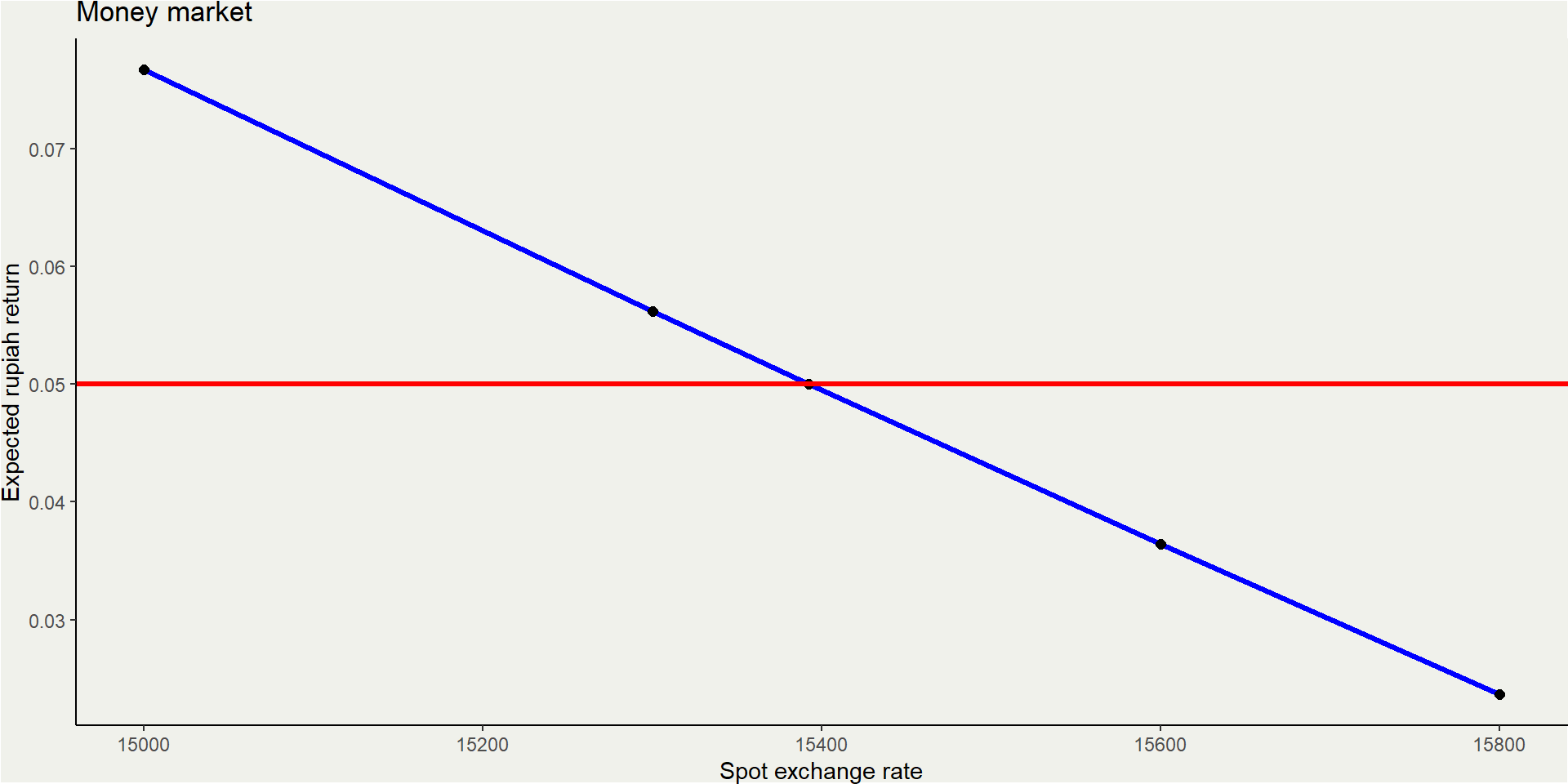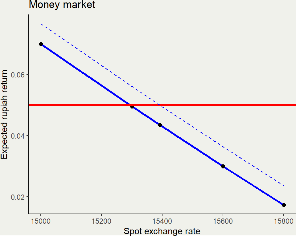 Blue line shows the rupiah return on dollar asset while the red line is the rupiah return on rupiah asset. Intersection is the equilibrium. Any point above red line is a case for holding dollar asset.