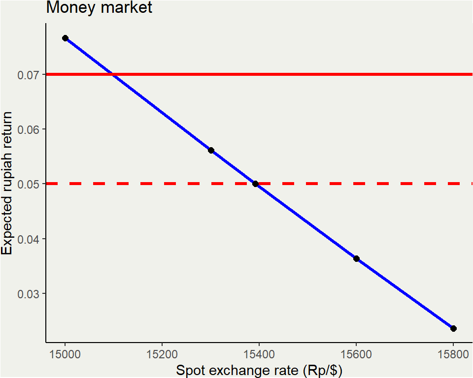 where ee is the expected depreciation of rupiah while fore is the expected rupiah return on dollar asset. Any spot higher than 15392 will create an opportunity to hold dollar asset, while the opposite is true for spot lower than 15392.