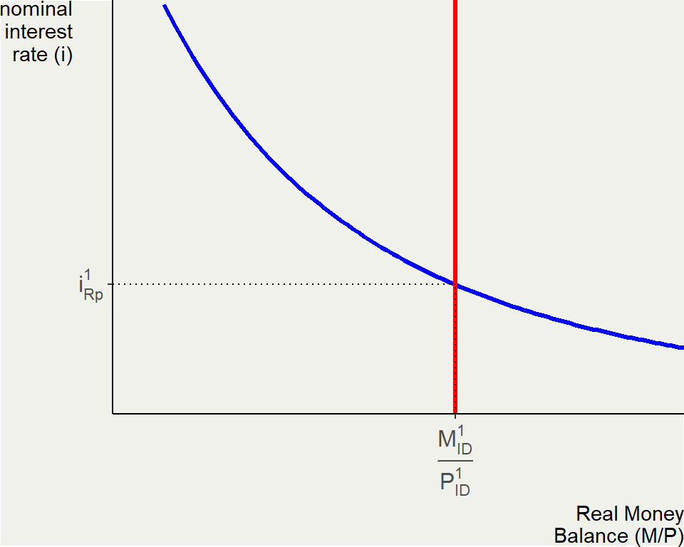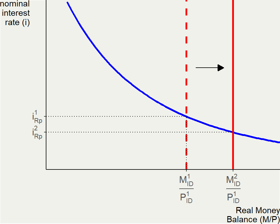 With a fixed price level \(P_{ID}^1\), an increase in nominal money supply from \(M^1_{ID}\) to \(M^2_{ID}\) will increase real money supply from \(\frac{M^1_{ID}}{P_{ID}^1}\) to \(\frac{M^2_{ID}}{P_{ID}^1}\). If nothing else happens on the demand curve, then the equilibrium interest rate is going down.