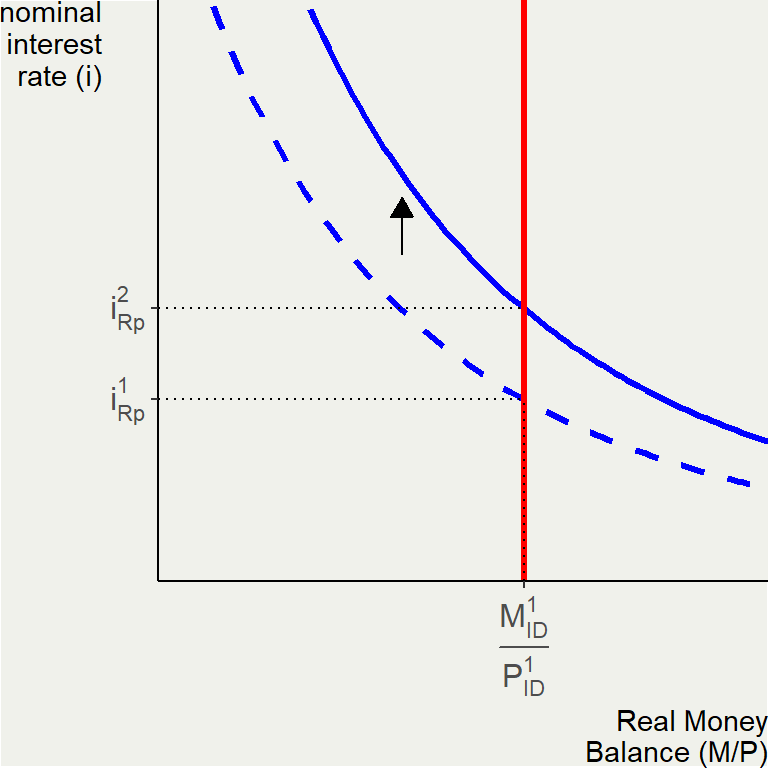 Suppose real income \(Y\) in Indonesia goes up, then \(\frac{M^d}{P}\) goes up, causing demand curve shifts to the right. If money supply stays the same, then the higher demand for money will rise interest rate in the equilibrium.
