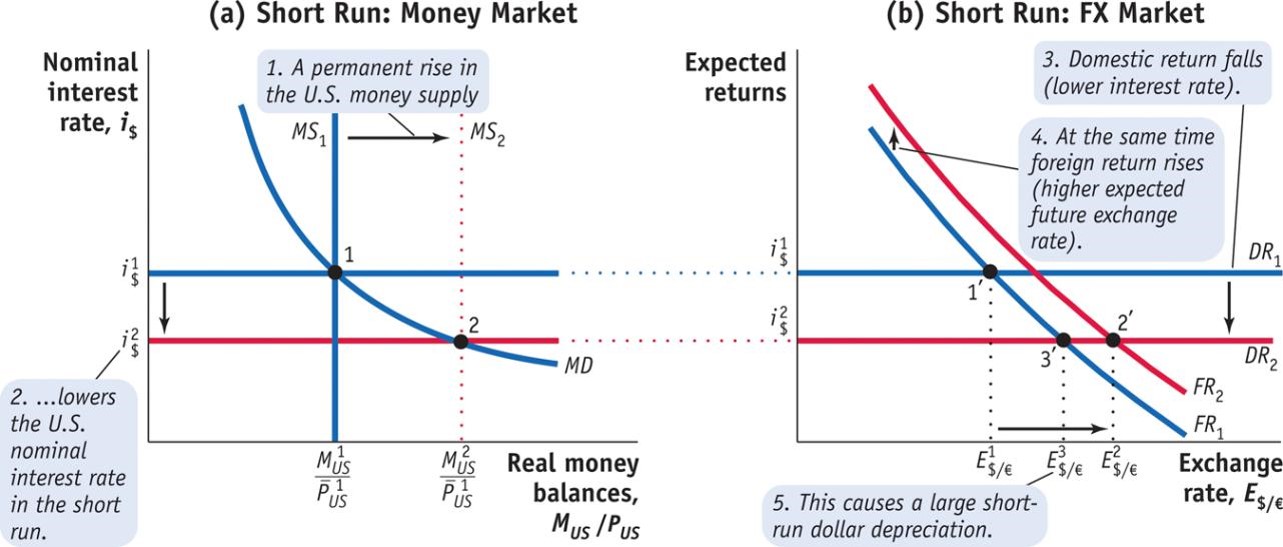 The permanent increase in real money suppy has two effect: (1) reducing interest rate (DR), and (2) Permanent depreciation of dollar (FR).