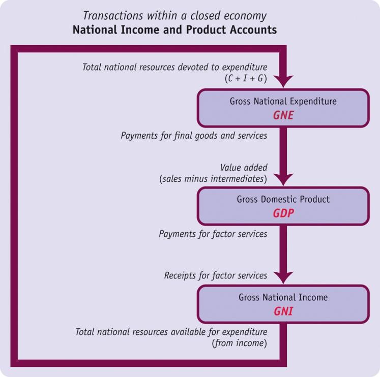 The Closed Economy Measurements of national expenditure, product, and income are recorded in the national income and product accounts, with the major categories shown. The purple line shows the circular flow of all transactions in a closed economy.