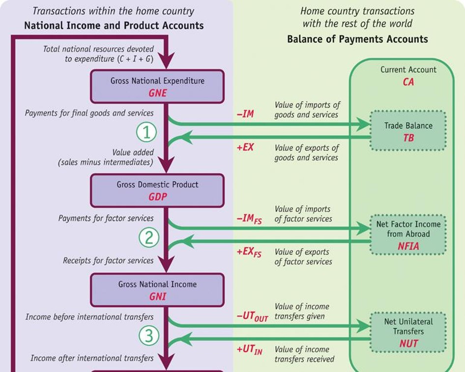 The Open Economy Measurements of national expenditure, product, and income are recorded in the national income and product accounts, with the major categories shown on the left. Measurements of international transactions are recorded in the balance of payments accounts, with the major categories shown on the right. The purple line shows the flow of transactions within the home economy. The green lines show all cross-border transactions.