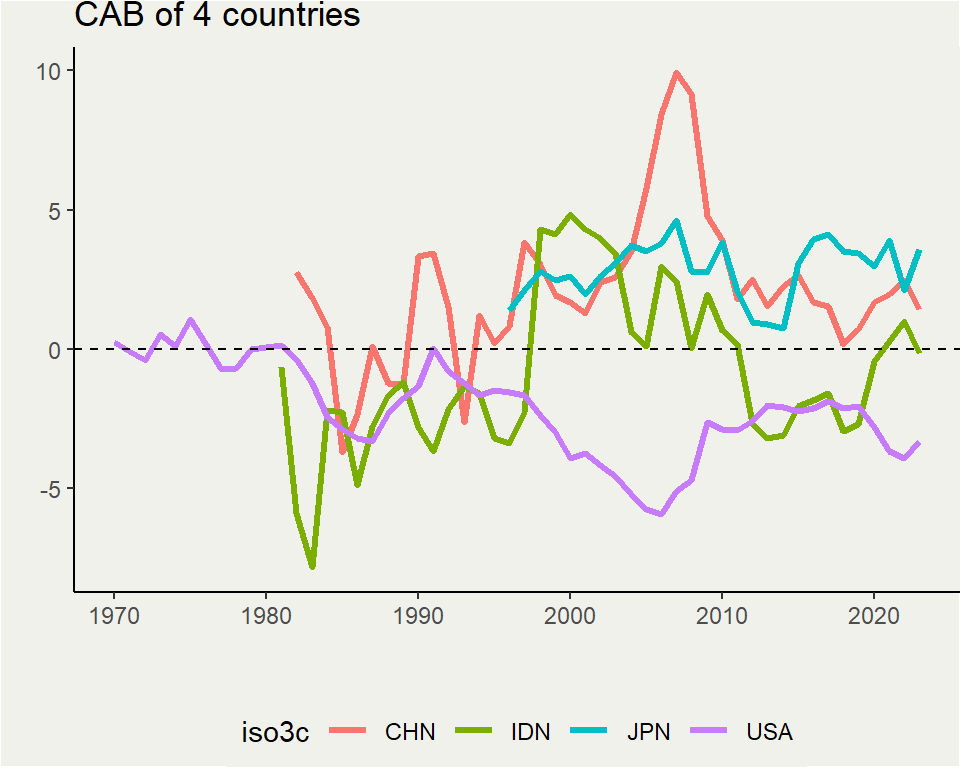 This graph shows current account balance of the 4 countries. Indonesia sees a surplus during the commodity boom, but overall moves around. China and Japan sees a constant surplus while the US a constant deficit. Japan and China = net creditors, USA = net debtor.
