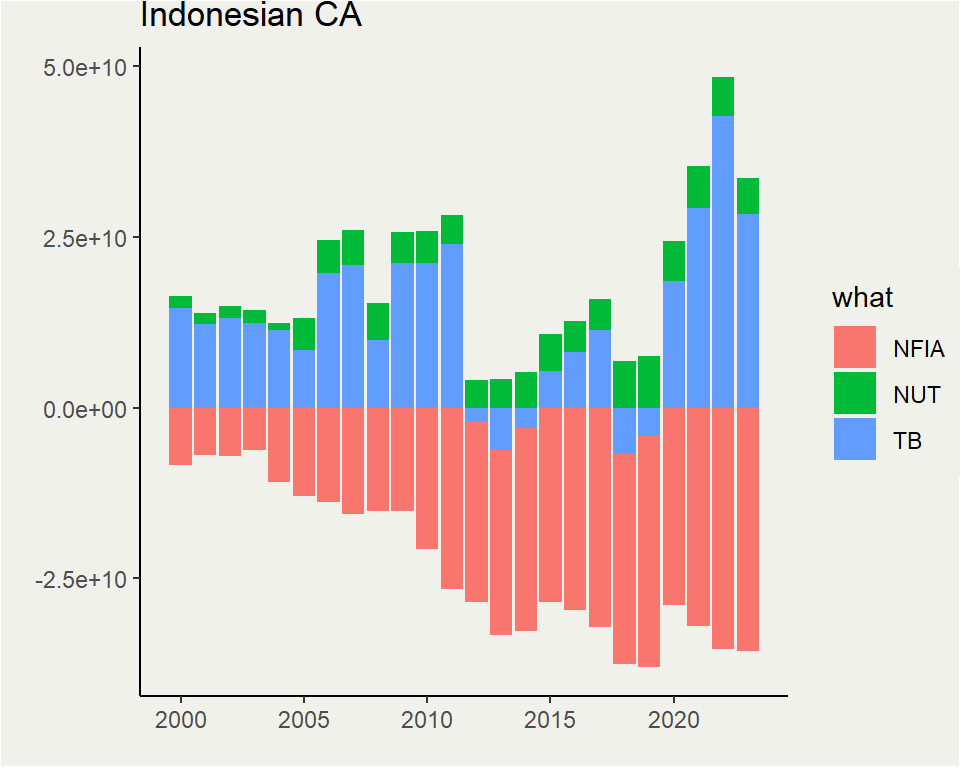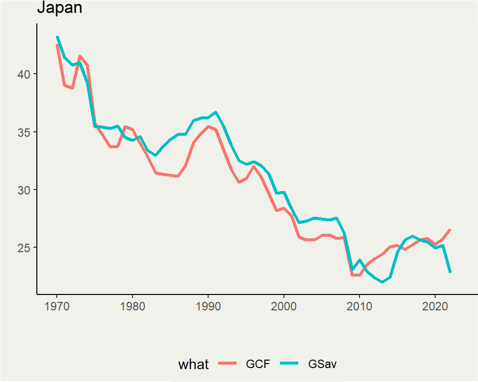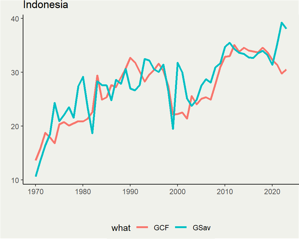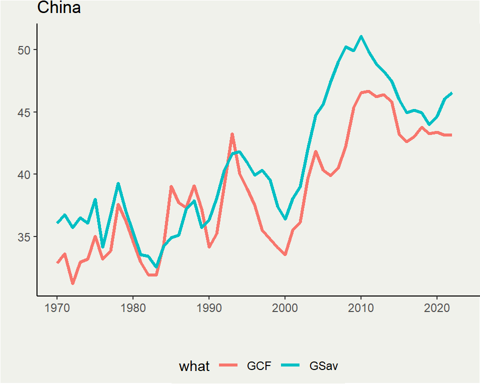 China, meanwhile, see a constant CA surplus with no notable decrease in saving rate (like Japan), but instead tend to go up (like Indonesia)