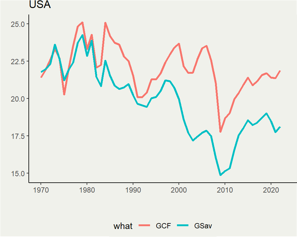 USA constantly has higher GCF compared to its saving rate. Meaning, US sees a constant CAD (current account deficit) which seems to be increasing in 2000s.