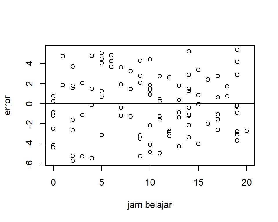 plot (dat2$ X,dat2$ u,xlab= "jam belajar" ,ylab= "error" )