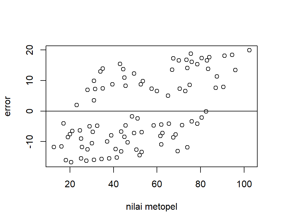 plot (dat2$ Y,dat2$ u,xlab= "nilai metopel" ,ylab= "error" )