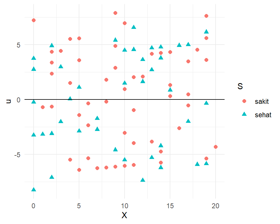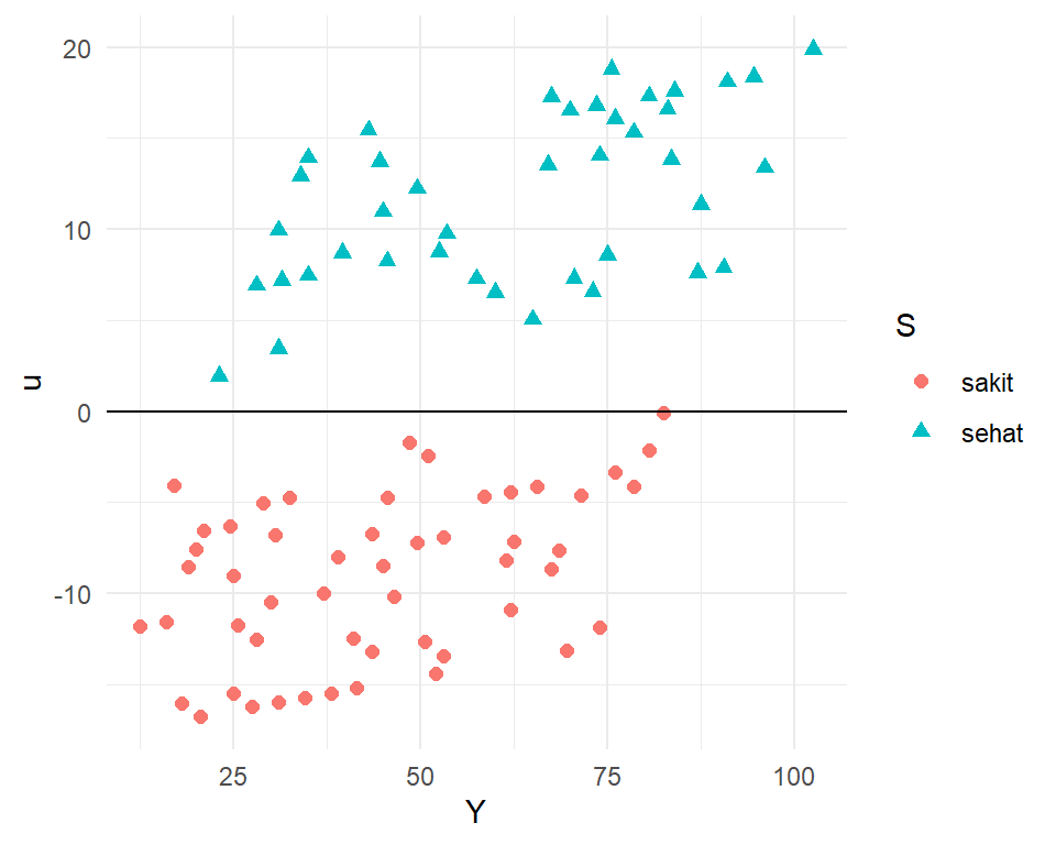 Untuk observasi sehat: \(Y=\beta_0+\beta_2+\beta_1X+\mu\)