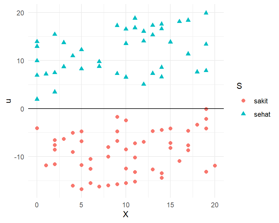 Untuk observasi sakit: \(Y=\beta_0+\beta_1X+\mu\)
