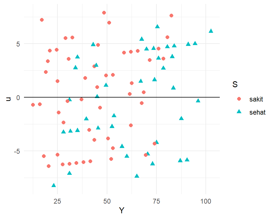 Akan tetapi, \(\mu\) tidak terdistribusi secara random terhadap \(Y\) .