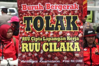 Workers protest in front of the House of Representatives in Central Jakarta against the proposed omnibus bill on job creation on Jan13. (JP/Seto Wardhana)Abstrak