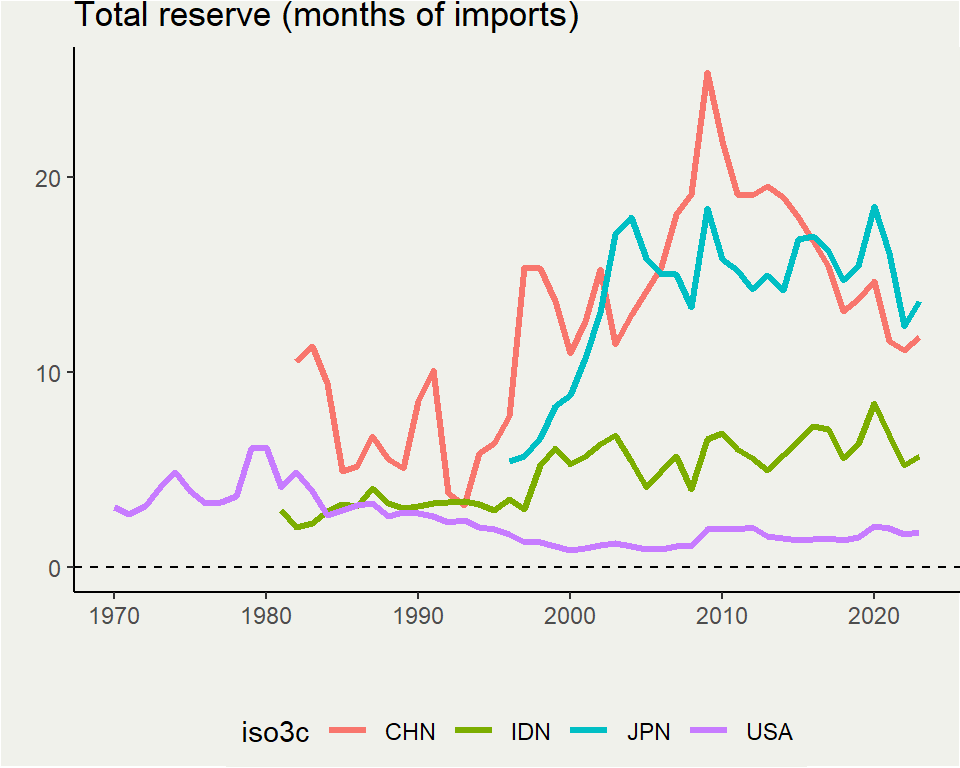 Cadangan devisa sejak 1998 selalu di atas 6 bulan. Tapi lihat Jepang+China!