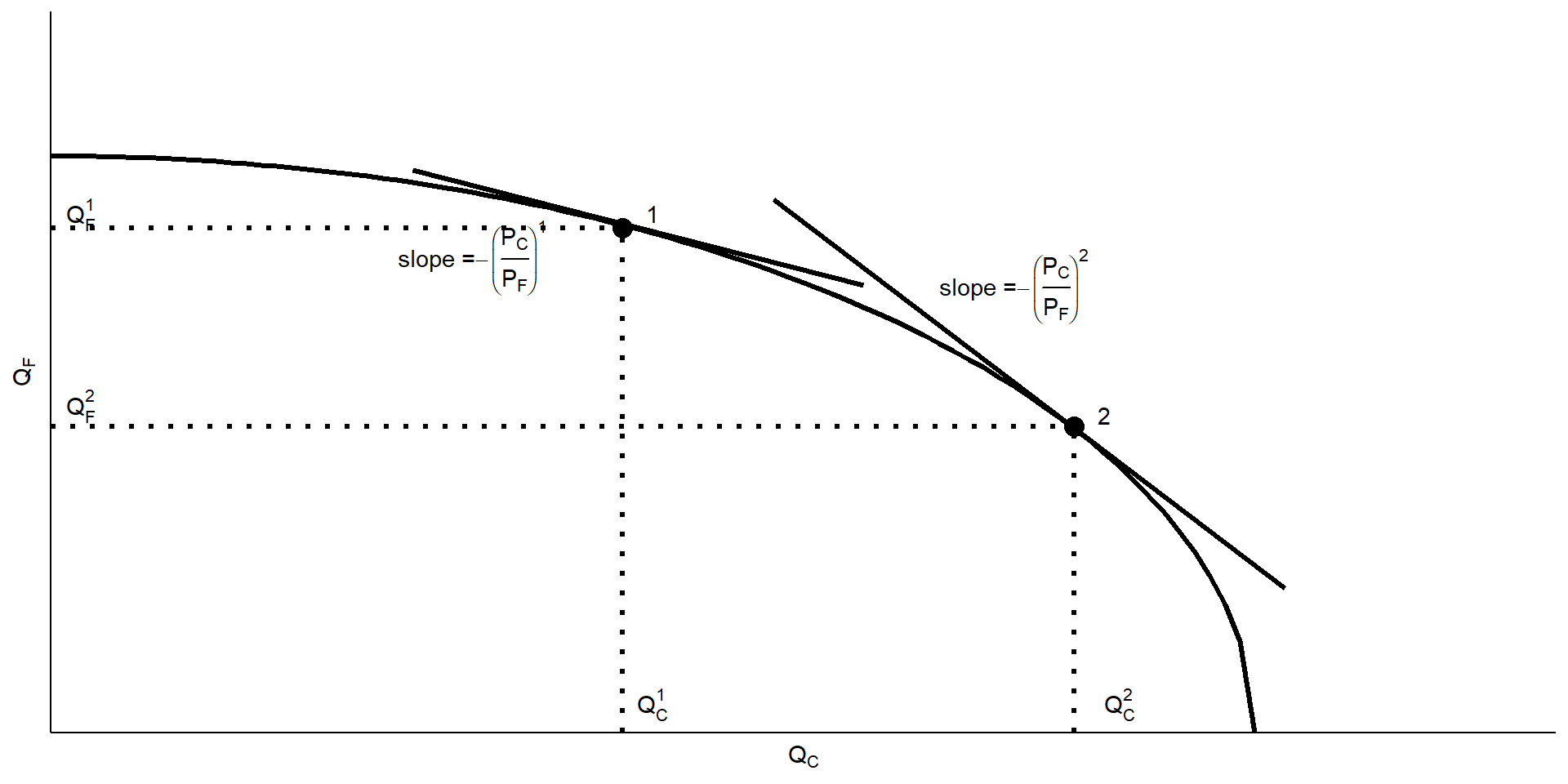 -\frac{MPL_F}{MPL_C}=-\frac{P_C}{P_F}=w=\text{slope PPF}