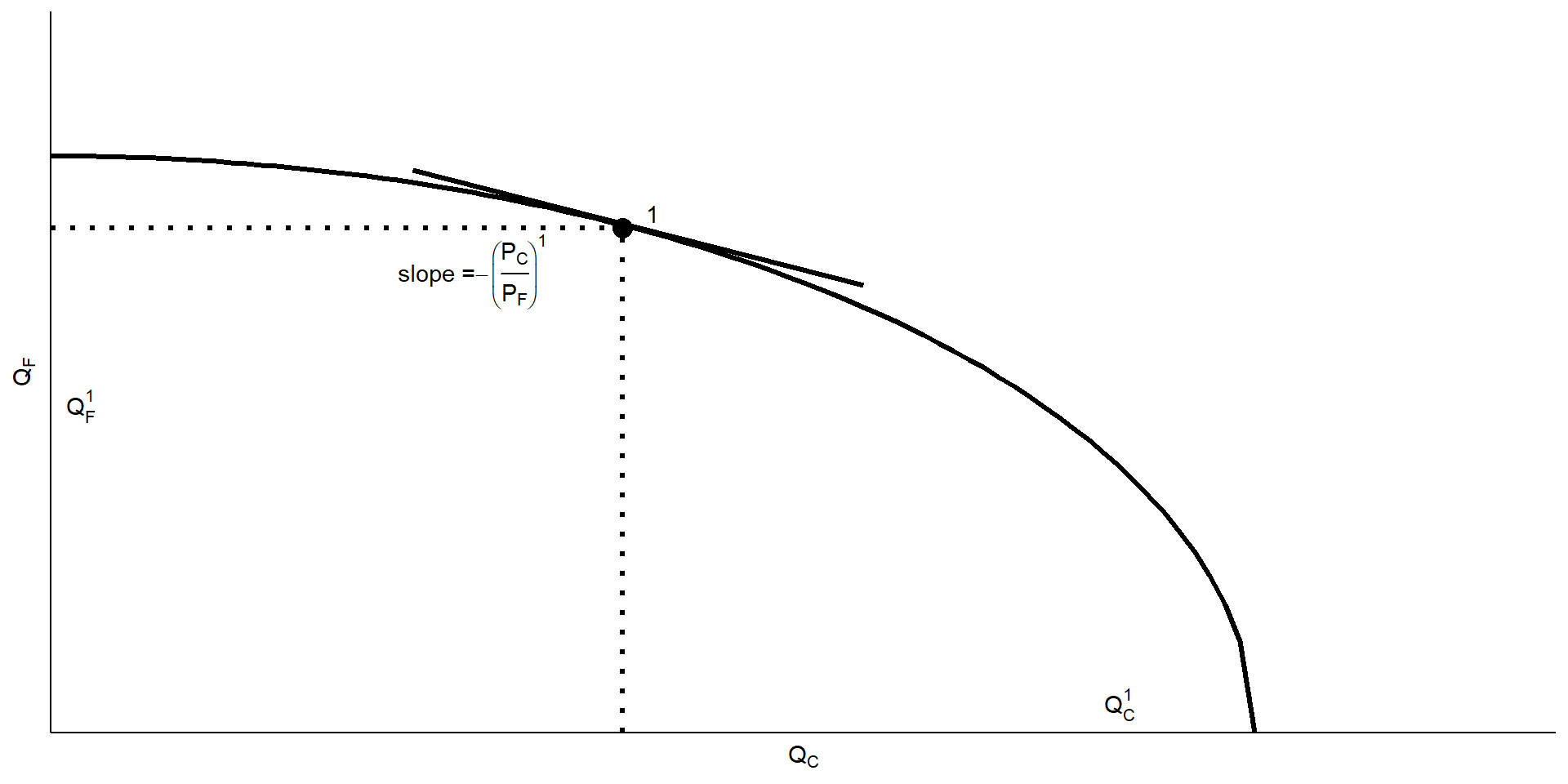 - Produksi terjadi di titik 1, di mana kurva PPF bersinggungan dengan price ratio.